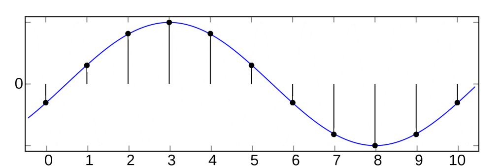 We can try to approximate an analog signal with a digital signal. Essentially the idea is to take snapshots of the analog signal, called samples. It’s the same idea as a camera taking many still images to re-create smooth motion. The result looks like this: